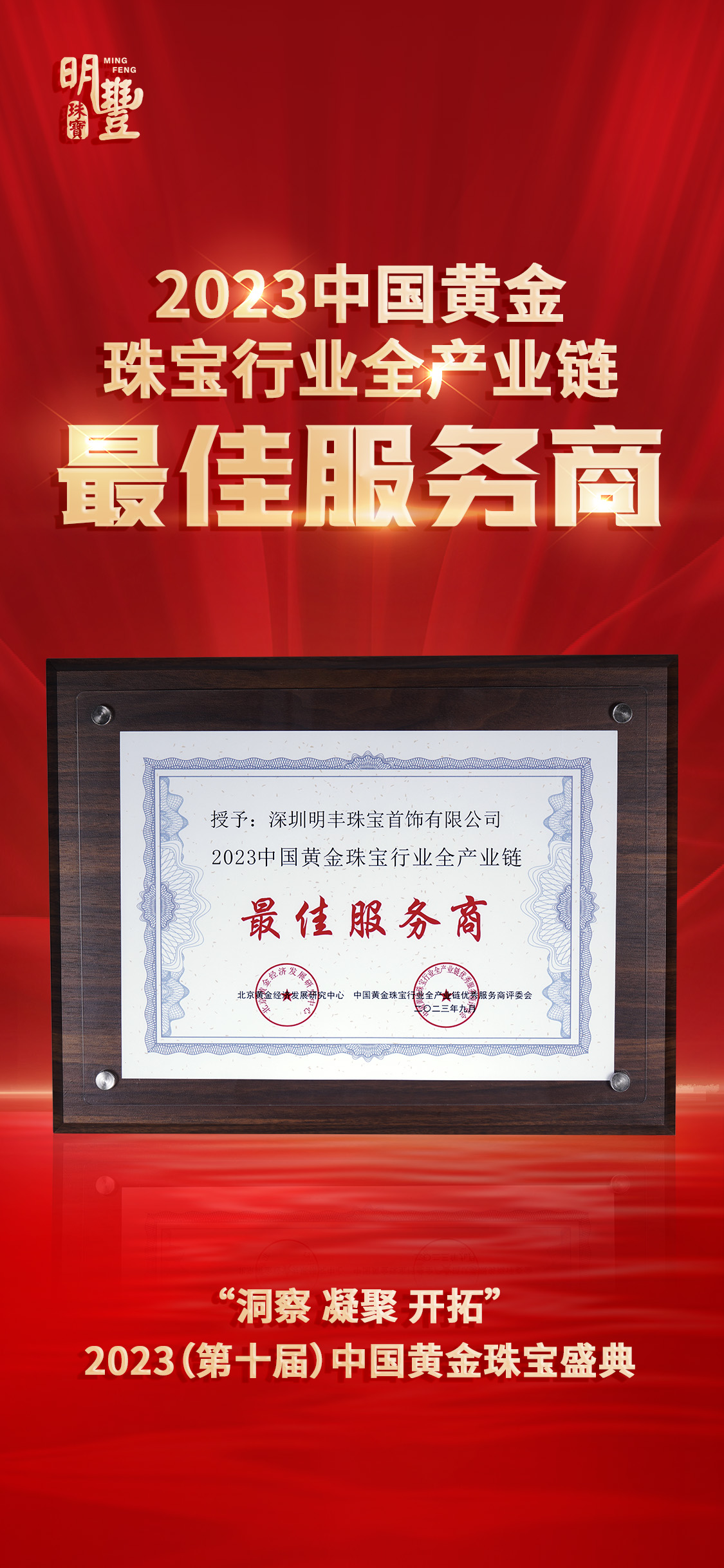 盛典上《2023中國黃金珠寶行業(yè)全產(chǎn)業(yè)鏈優(yōu)秀服務(wù)商名錄》正式發(fā)布,明豐珠寶斬獲“2023中國黃金珠寶行業(yè)產(chǎn)業(yè)鏈-最佳服務(wù)商”榮譽稱號。